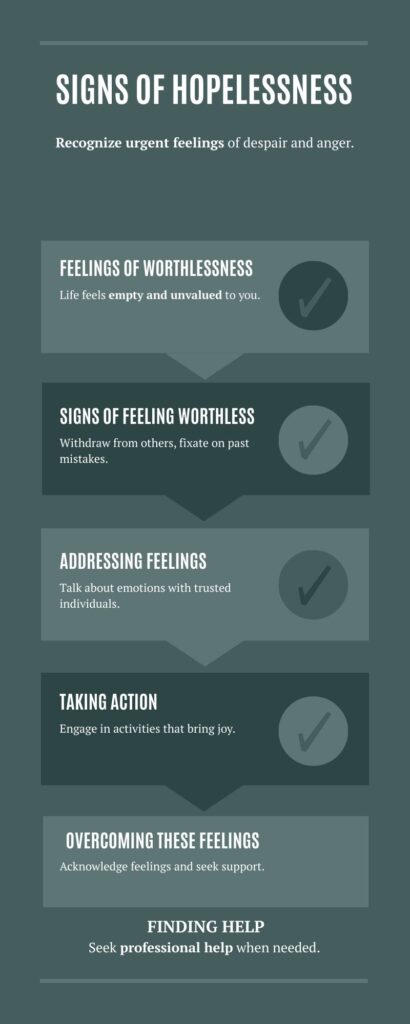 Those who struggle with hopelessness might deal with angry outbursts that don’t match the situation, limited sex drive, problems sleeping or eating, and a lack of participation in activities or hobbies that were once enjoyable.